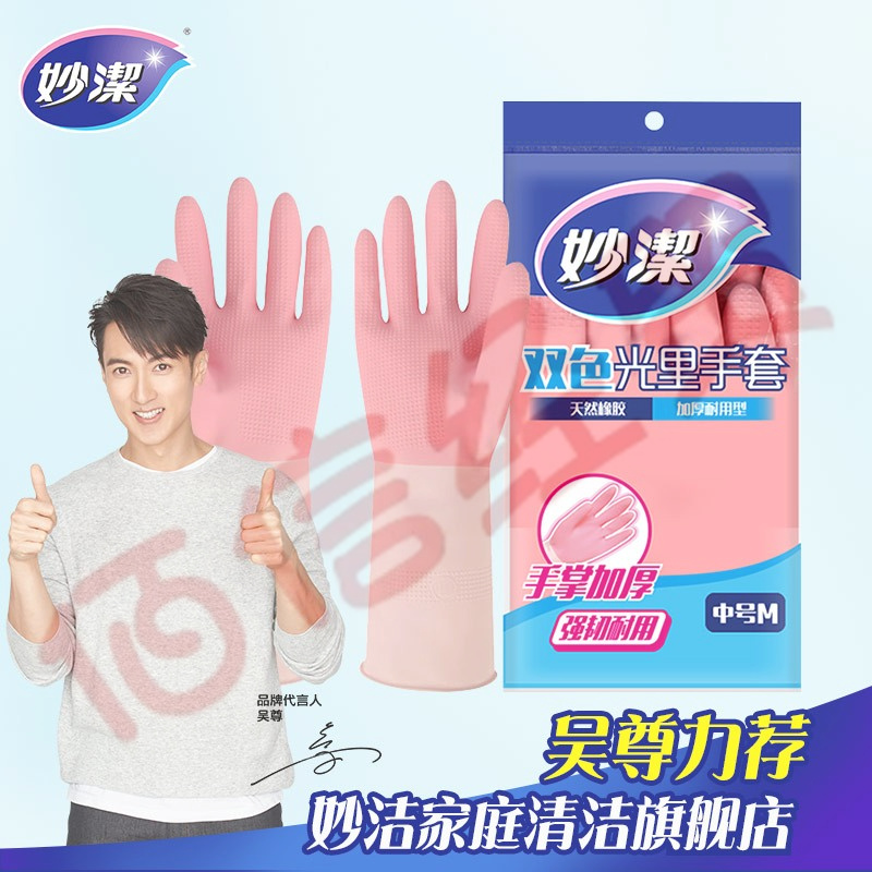 妙潔 雙色光里手套加厚手掌清潔家務(wù)洗衣橡膠皮防水洗碗手套 中號(10個起售) 自營