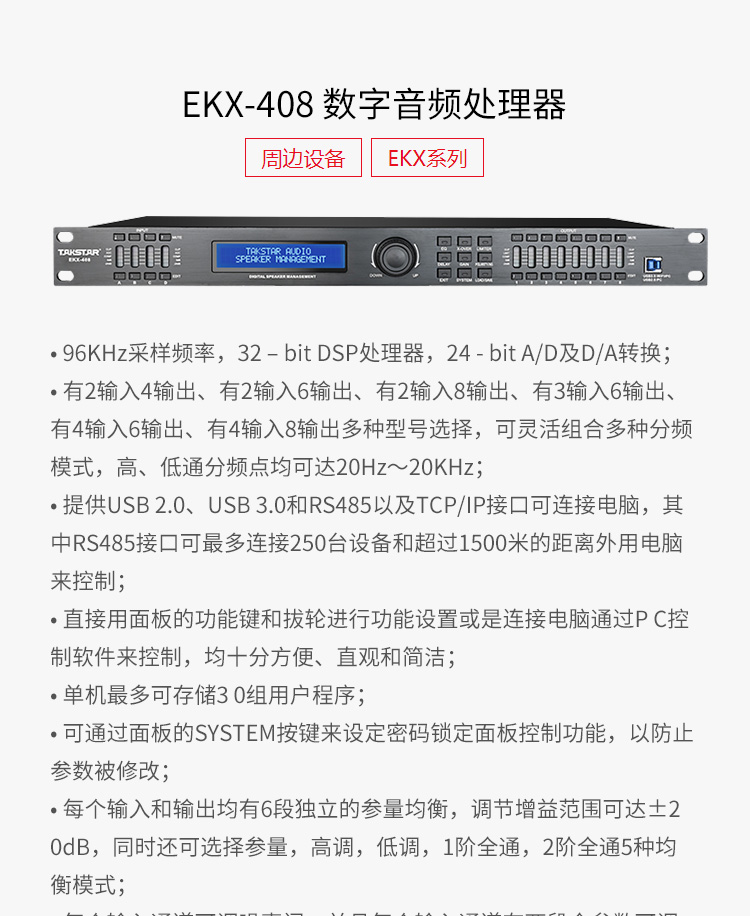 得勝(TAKSTAR) EKX-408 數(shù)字音頻處理器 4進8出音頻處理器 USB端口控制舞臺劇院演出酒吧音頻系統(tǒng)處理器 自營