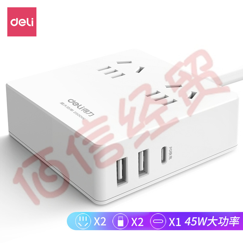 得力(deli)PD/QC快充插座(45W) 2USB+Type-C口 1.5米白 33650 自營