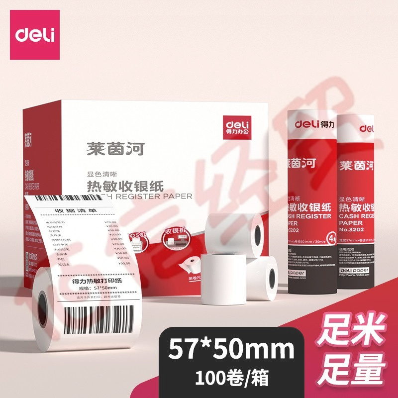 得力3202萊茵河熱敏收銀紙 57*50mm美團(tuán)外賣小票紙 超市餐飲收銀機打印紙 100卷(20米/卷)單卷足米 自營