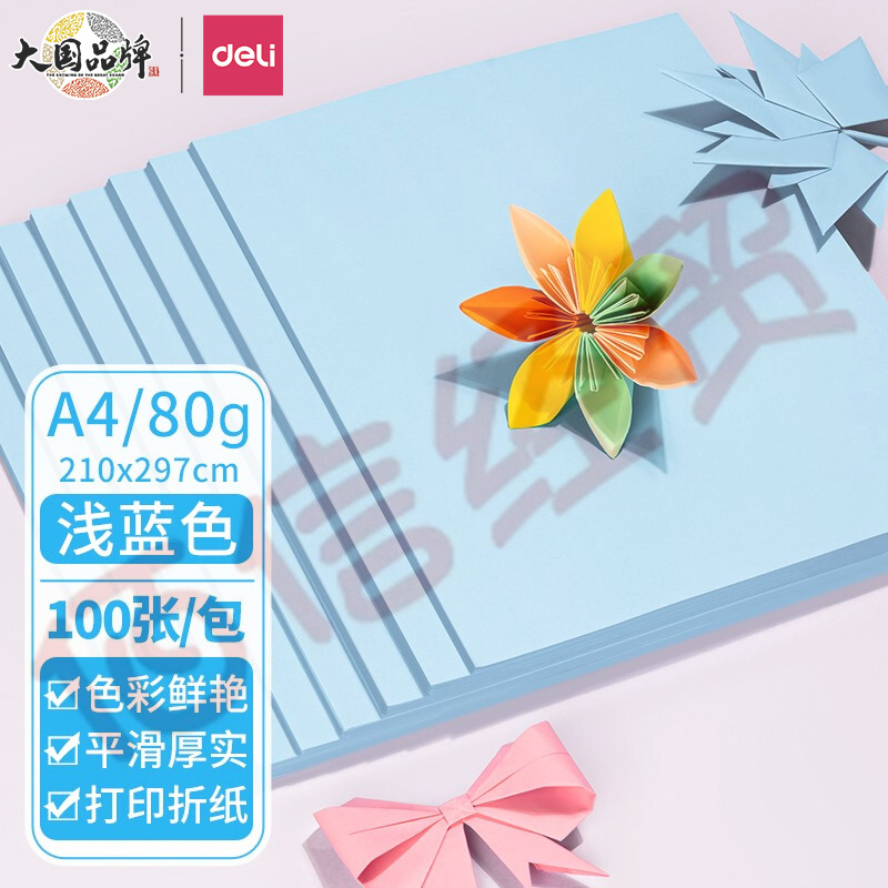 得力(deli)A4 80g淺藍色復印紙 彩色打印紙 兒童手工折紙剪紙彩紙 非硬卡紙 100張/包 7757 自營