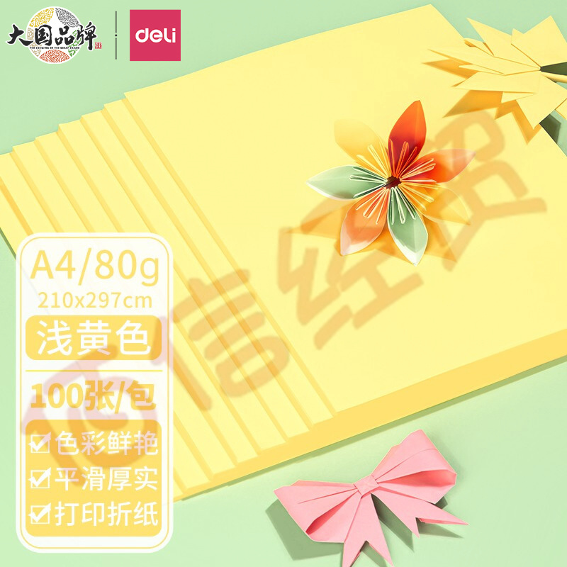 得力(deli)A4 80g淺黃色復(fù)印紙 彩色打印紙 兒童手工折紙剪紙彩紙 非硬卡紙 100張/包 7757 自營