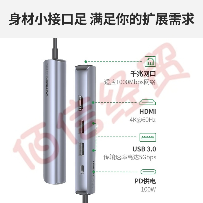 綠聯 Type-C擴展塢 USB-C轉HDMI轉換器網口分線器拓展塢4K投屏適用蘋果mac雷電4電腦 【五合一】HDMI +千兆網口+PD+USB*2 自營