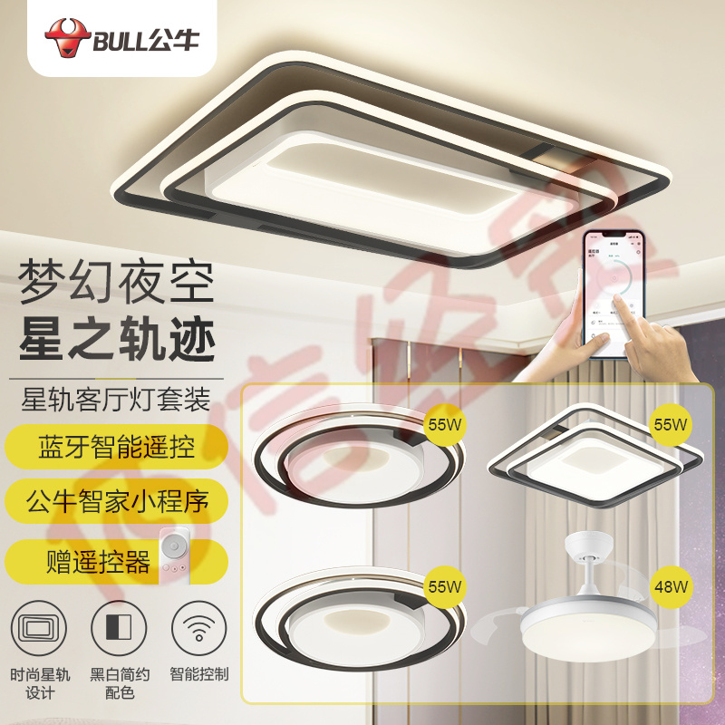 公牛(BULL)LED吸頂燈X35星軌系列MX-M130A-CD小程序控制無極調光三檔調色 客廳燈+方形燈+圓形燈*2+風扇 自營