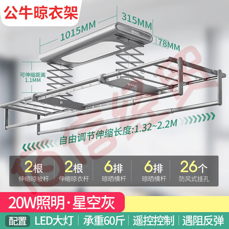 ¥959.30公牛晾衣架公牛智能電動晾衣架遙控升降衣被同曬智能語音控制智能 基礎(chǔ)款照明+遙控+24孔+4晾桿GJ221AT