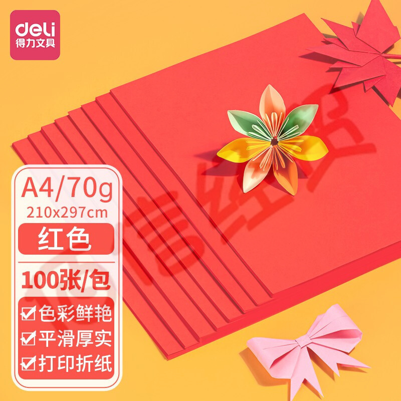 得力(deli)7393 復(fù)印紙 彩色打印紙 兒童手工折紙剪紙彩紙 A4 70g大紅色 100張/包 自營(yíng)