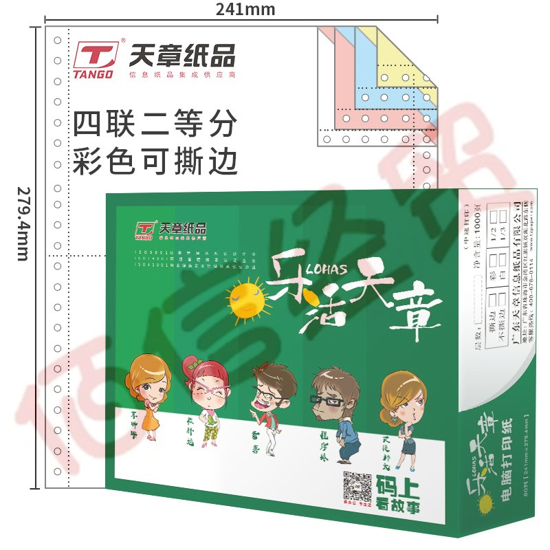 天章(TANGO)樂活天章 針式打印紙 四聯(lián)二等分撕邊電腦打印紙 彩色四聯(lián)打印紙241-4-1/2S 白紅藍黃 1000頁/箱