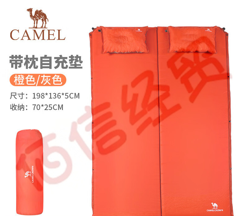 駱駝(CAMEL)戶外充氣墊露營野餐防潮墊帳篷底墊雙人帶枕自充墊床墊地墊 橙色/灰色 自營