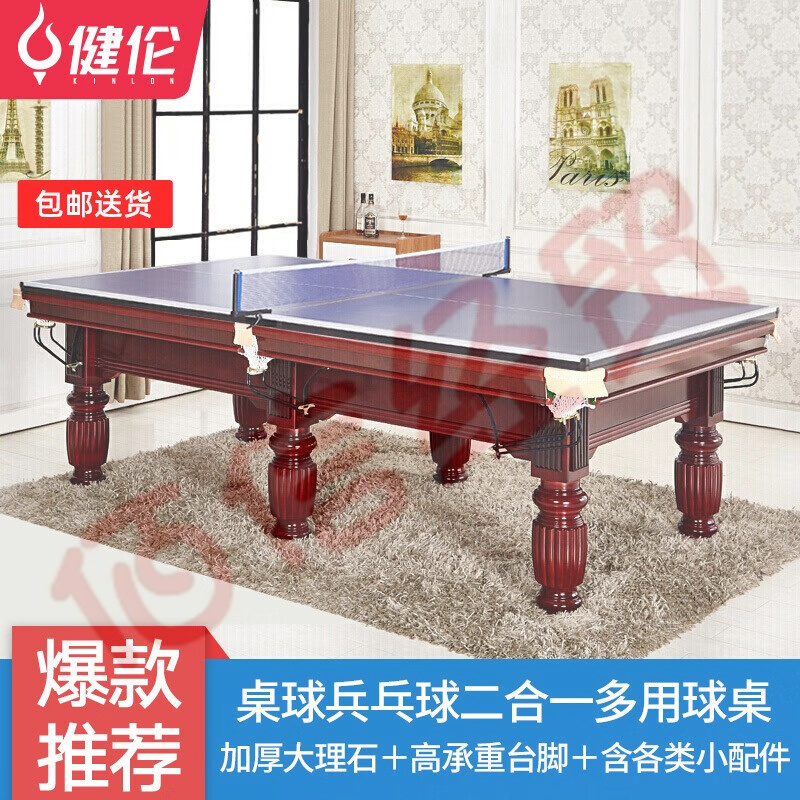 健倫(JEEANLEAN) 臺球桌 標準成人家用桌球臺美式黑八落袋臺球案二合一乒乓球 二合一球桌標配(金/銀/棕) 自營