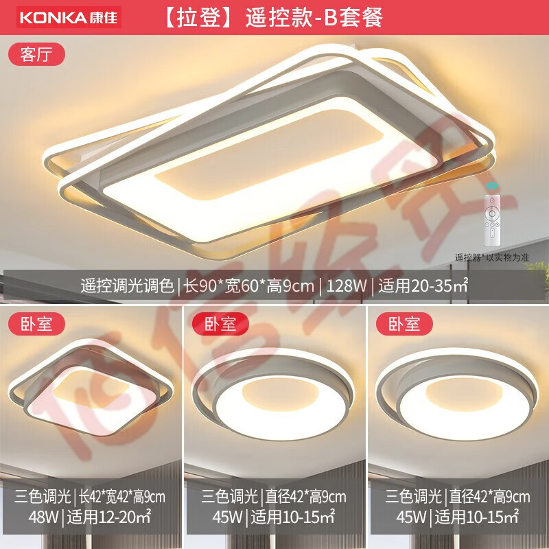 康佳(KONKA)LED吸頂燈客廳大燈臥室書房全屋燈具套餐【拉登】48瓦-三色調(diào)光 【拉登】 3室1廳 自營