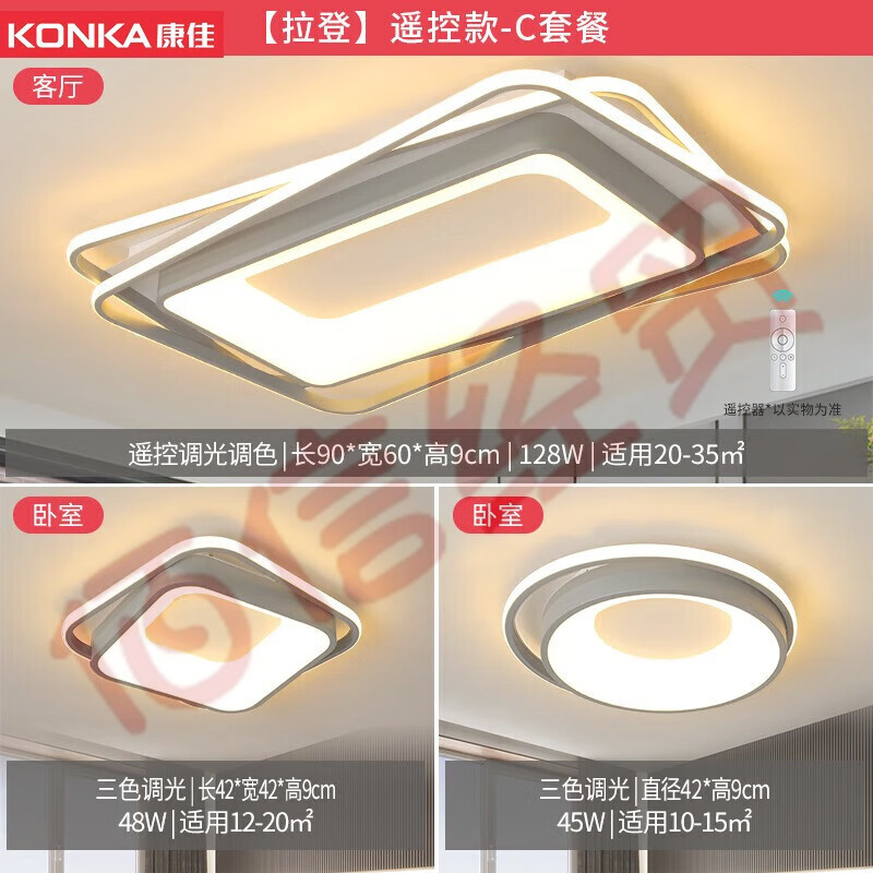 康佳(KONKA)LED吸頂燈客廳大燈臥室書房全屋燈具套餐【拉登】48瓦-三色調(diào)光 【拉登】2室1廳 自營
