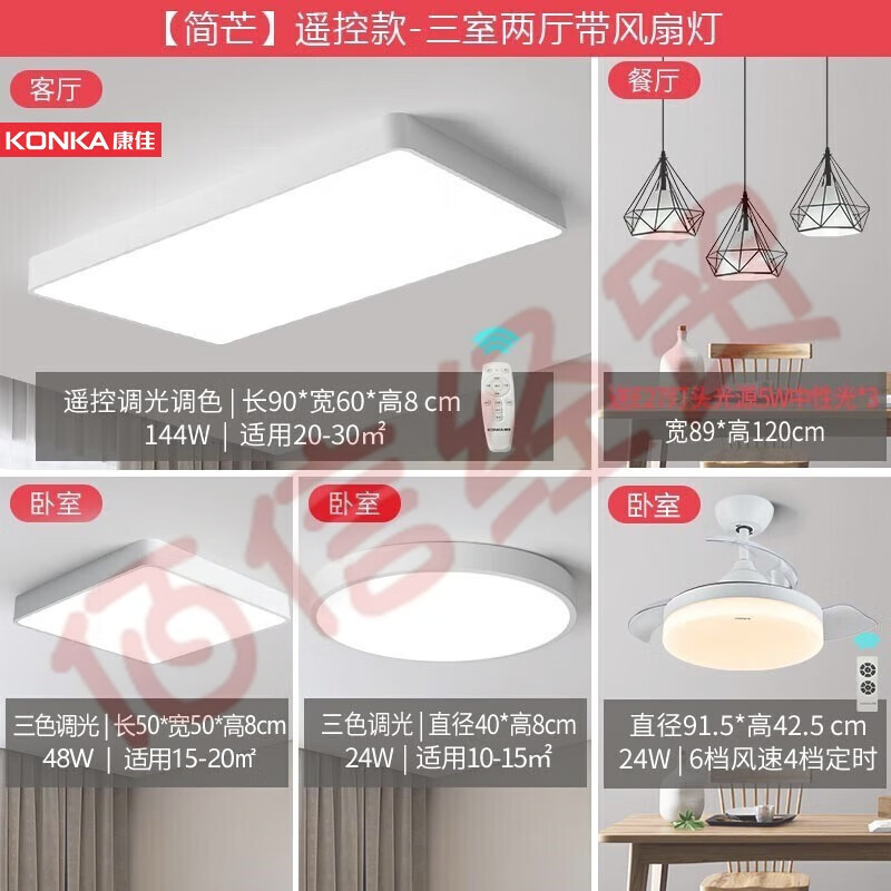 康佳(KONKA)吸頂燈簡約大氣客廳餐廳臥室燈飾全屋組合燈具套餐 【簡芒】三室二廳(帶風扇) 自營