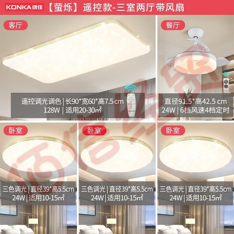 康佳(KONKA)臥室燈吸頂燈客廳燈具書房遙控LED燈調(diào)光調(diào)色全屋燈飾套餐 螢爍 【螢爍】3室2廳/帶風(fēng)扇 自營
