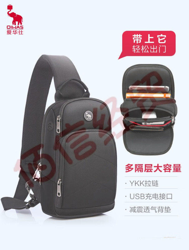 愛華仕男士胸包單肩包休閑運動斜挎包男士通勤包包大學(xué)生輕便手機包5673 黑色 自營