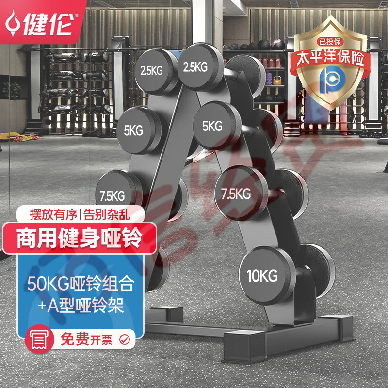 健倫(JEEANLEAN)啞鈴男士健身器材啞鈴套裝環(huán)保包膠四副啞鈴架50KG組合 自營