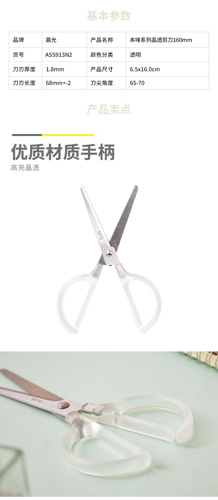 晨光 本味系列晶透剪刀160/180mm高亮晶透鋒利耐用辦公商務剪刀圓角剪刀頭手工裁剪ASS913N 1把【160mm】913N2 自營