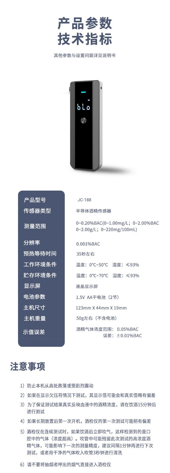 警藍(lán)偉業(yè)酒精測試儀吹氣式呼氣酒精檢測儀查酒駕專用檢測儀測酒駕JC-188黑色 自營