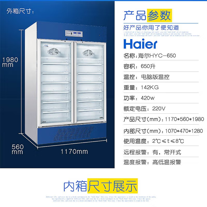海爾(Haier)藥品冷藏箱 2-8℃醫(yī)藥冷藏柜風(fēng)冷無霜冰柜醫(yī)藥冷柜 藥品保鮮柜HYC-650 自營(yíng)