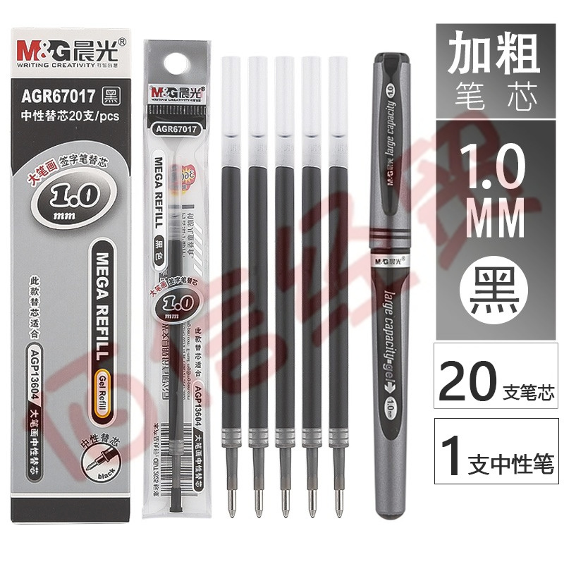 ■晨光1.0mm頭中性簽字水筆芯替芯 黑色粗管大容量加粗中性筆芯簽名筆芯 AGR67017 黑色盒裝20支+1支筆 自營