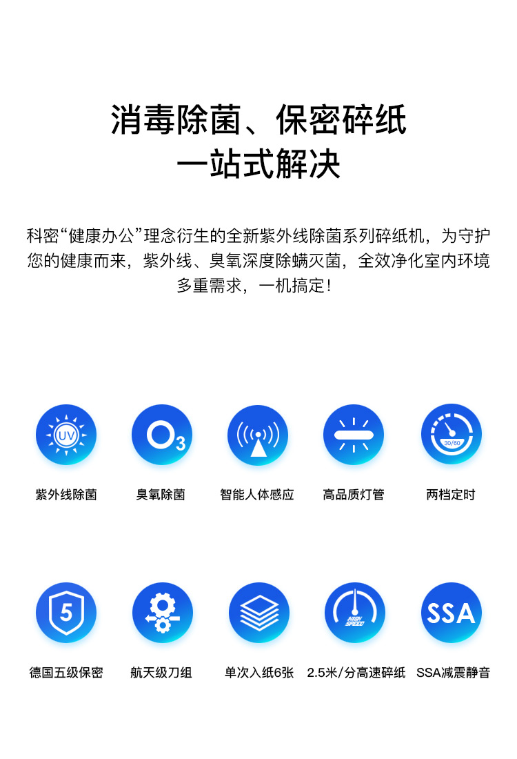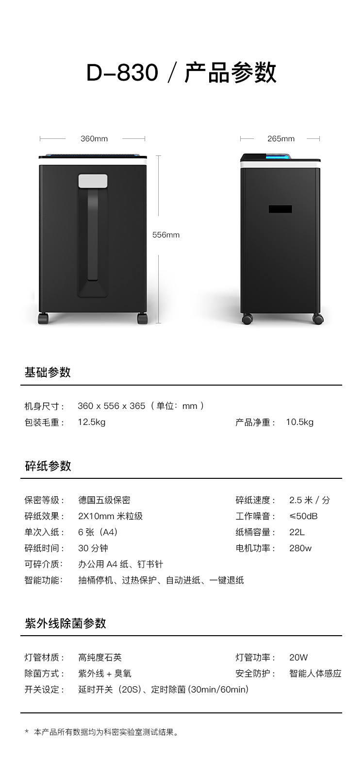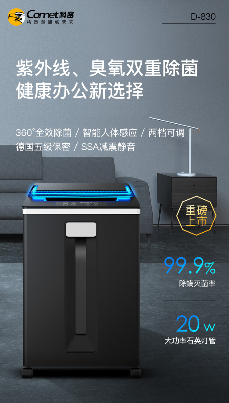科密(comet)D-830 碎紙機 紫外線臭氧除菌除螨 德國5級高保密彈簧減震 辦公商用家用紙張粉碎機 自營